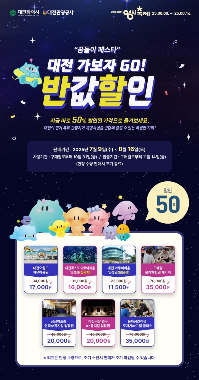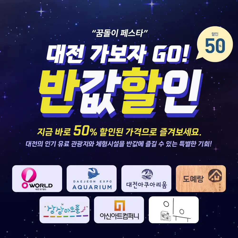 대전시가 준비한 ‘대전 가보자 GO! 반값 할인’ 프로모션으로 부담 없이 대전을 즐겨보세요! 이번 할인 이벤트는 2025 대전 0시 축제와 연계되어, 관광과 문화체험을 한 번에 즐길 수 있는 절호의 기회입니다.